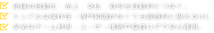 | 取引・仕訳管理(Transactions) | 会計帳簿の自動生成 | すべての入出金を勘定科目で整理し、正しい仕訳を形成 |