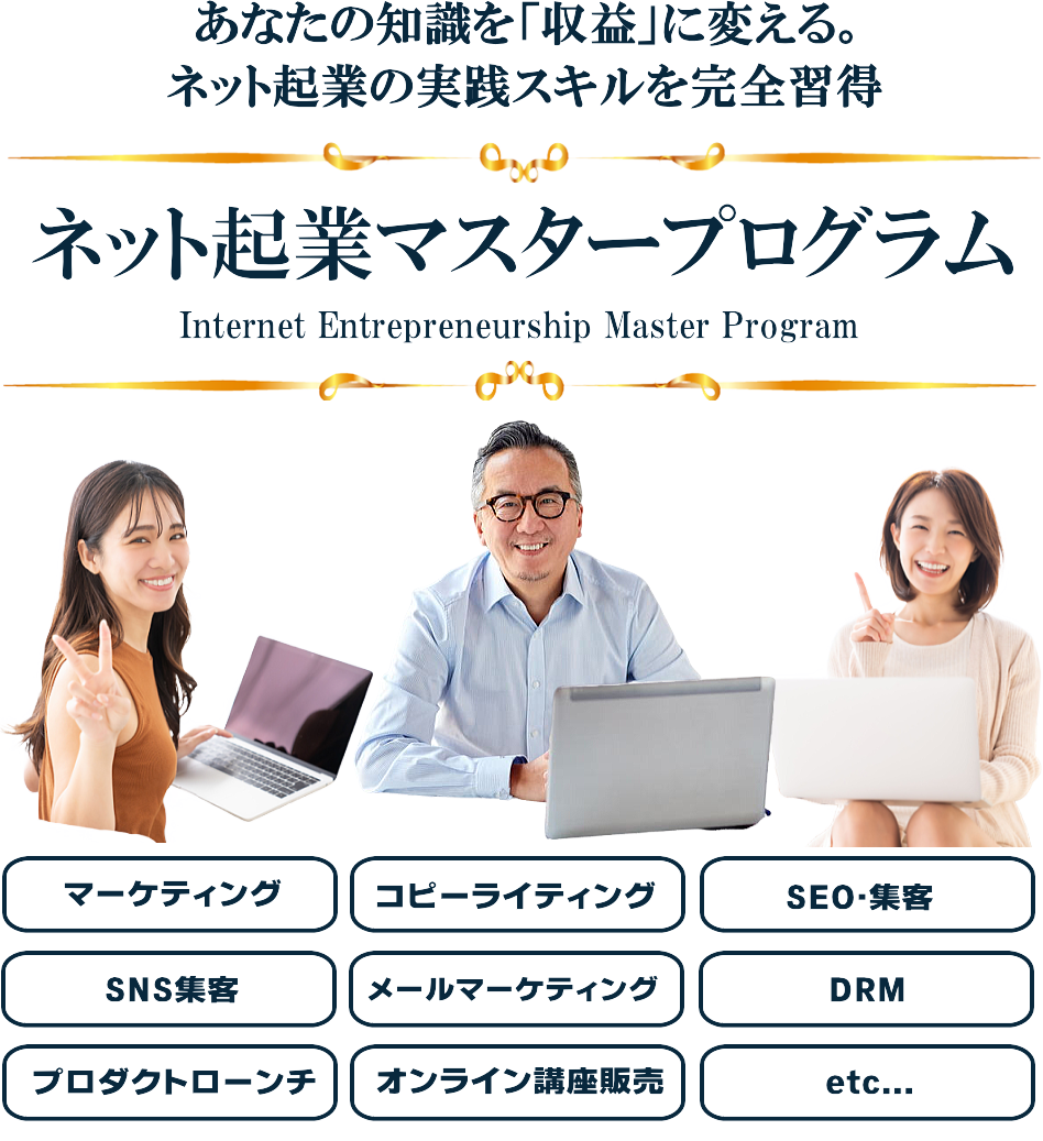 『ネット起業マスタープログラム』は、インターネットを活用して収益を生み出すための知識とスキルを、基礎から実践まで体系的に学べるオンライン講座です。